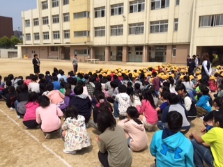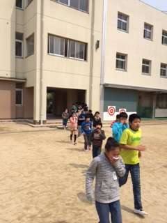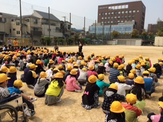 給食室からの出火を想定した避難訓練です。雨で延び延びになっていました。ハンカチを口や鼻にあてて、上手に避難することができました。