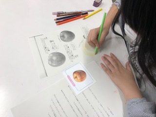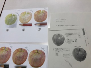今日はりんごを色鉛筆で塗って、光の当たっている感じや立体感を表していきました。