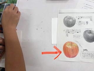 下の写真の赤い矢印は、児童が描いたりんごの絵です。りんごそのものに見えるできばえです。