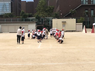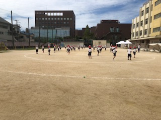 下の写真は、台風接近のため幌をはずしていたテントです。今は幌をテントまで運んでいます。放課後に張っていきます。