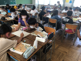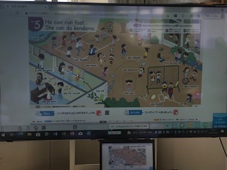電子黒板にはスポーツや楽器演奏などをしている絵が映し出されています。