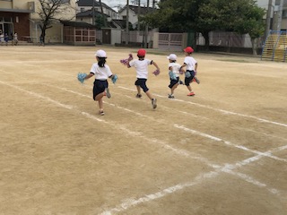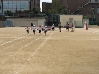 1年前の徒競走です。運動場の真ん中を講堂に向かって走ります。(今日は団体演技で使ったものを手に持っていますが当日はつけません)
