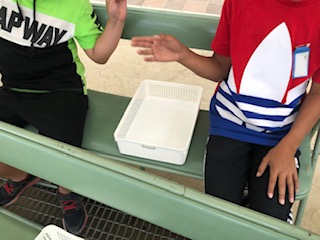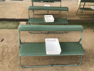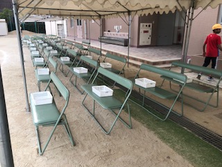 児童席は校舎側に設けています。長椅子に2人ずつ座ります。間にプラケースを置いて間隔を開けてようにしています。このプラケースの中には水筒などを入れておきます。