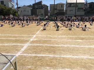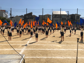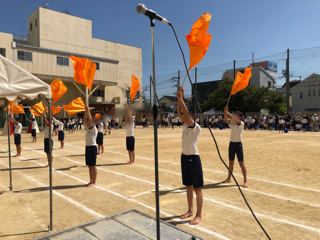 5・6年生の団体演技です。一人での体操の後、フラッグ(旗)を持って演技しました。