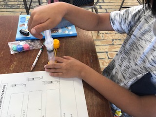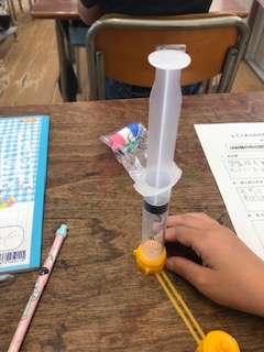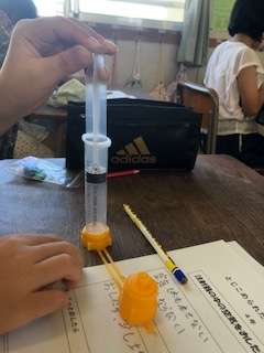 一人一人が持っている教材の注射器で空気を閉じ込めて変化を確かめました。