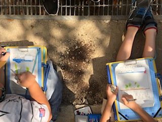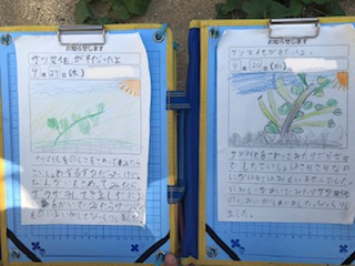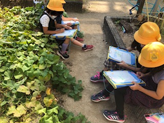 サツマイモが育ってきています。今日はつるや葉の様子を見て観覧カードにかきました。