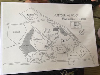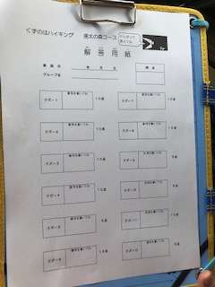 カレーライスでおなかがいっぱいになった後は、くずのはハイキングです。クイズのオリエンテーリングです。地図と問題、解答用紙を持って班ごとに歩いていきます。