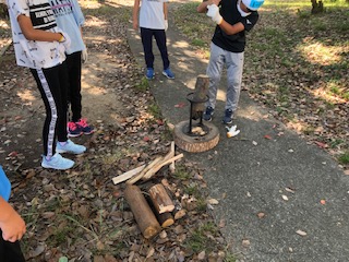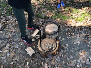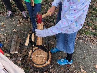 下についている刃にまきを置いてハンマーで叩いて割っていきます。のこぎりで切った丸太にも挑戦しました。