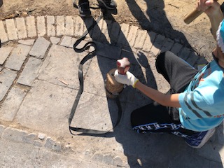 重い鉄のくさびを木に当ててハンマーで叩いていきます。協力しながらがんばっています。