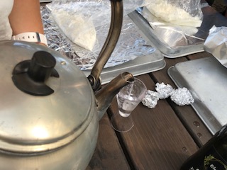 生地となる粉にオリーブオイルと水を入れていきます。