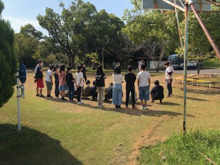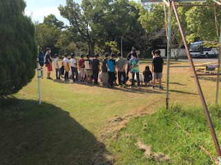 信太山野外活動センターのシンボル(?)の前でクラスごとに記念撮影をしました。