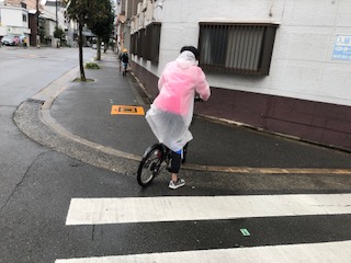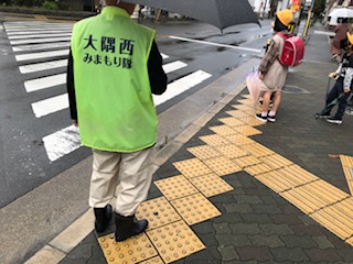 10月17日は日曜授業で防災学習を行います。登校時間に地域の方や教職員が見守り活動を行っています。