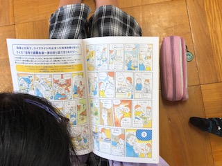 パンフレットのまんがを見ながら、地震が起こった後にどのようにしていけばよいかを考えました。防災スリッパも作りました。
