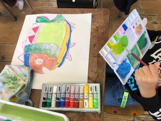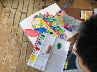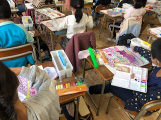 昨日、絵の具を塗り始めていた2年生の絵も,今日はかなり塗られたところが増えてきていました。