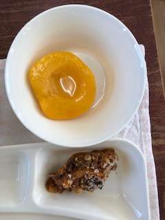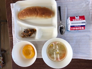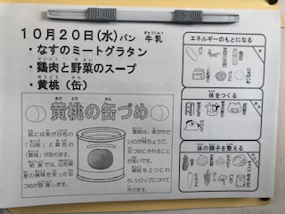 今日の給食にはグラタンがでました。缶詰の黄桃がつきました。