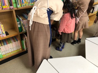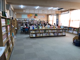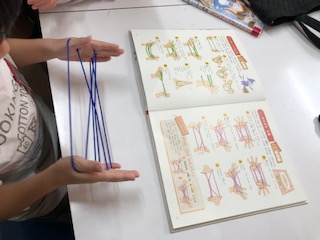 学校図書館で子どもたちが楽しく本を読んでいます。あやとりの本には毛糸もついていて子どもたちが絵を見ながらあやとりをしています。