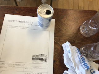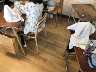 空き缶やペットボトルにタオルをかけて島を作っています。どんな島ができるのでしょうか。楽しみですね。