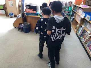 貸し出しカウンターには、本を借りる子どもたちが並んでいます。
