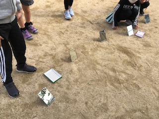 運動場で日光を鏡で反射させて光がどのように進むのかを確かめます。