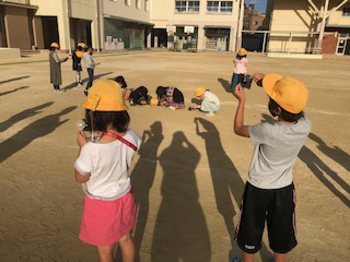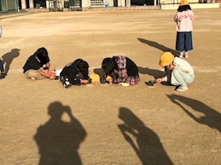 1、2年生の遠足から帰ってくると3年生が運動場で実験をしていました。