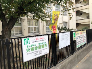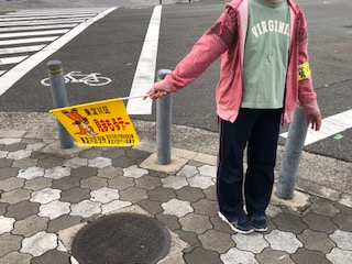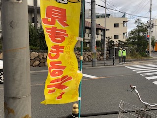 見まもりデーには地域のあちこちに黄色い旗を立てています。学校にも立てています。PTA役員・委員の方も旗を持って子どもたちの安全を確保しておられます。