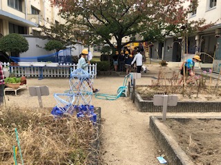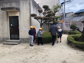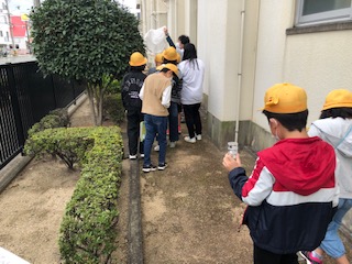 学校のいろいろな場所でグループごとに生き物を探していきます。