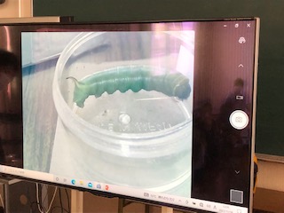 黒板には見つけた生き物の数が書かれています。どのグループも30から50もの生き物を見つけています。たくさんいると驚きます。また、電子黒板に拡大して映してくわしく説明もしてくださいました。