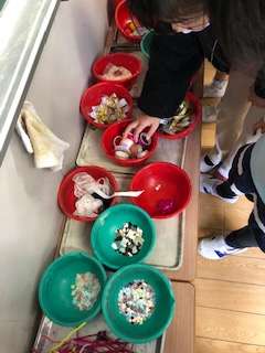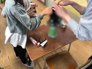 作品展に出す立体作品も仕上げの段階です。飾りに使う小物を選んでいます。形を整えたり、飾りをつけたりしながら仕上げています。(作品にはモザイク処理をしています。作品展当日をお楽しみください。)