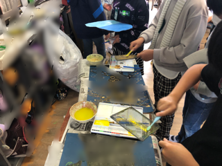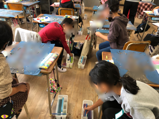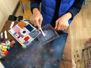 歯ブラシと網を使って絵の具を絵の上にかけています。また、ペットボトルのふたも使っていました。さて、どんな絵ができているのでしょうか。とても楽しみです。