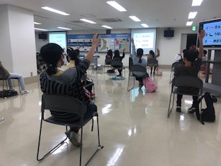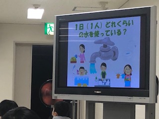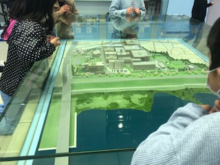 距離をとって座って説明を受けました。また、クイズで今日の見学の内容を学びました。甲子園球場の1.5倍の広さを持つ庭窪浄水場の模型も見ています。