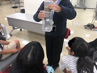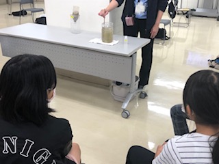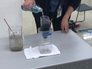 ペットボトルの実験装置を使って水がきれいになっていく様子を実験で見ていきます。その様子を子どもたちは興味いっぱいで見ています。