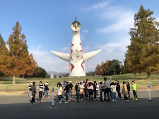 万博公園の太陽の塔をバックに記念写真を撮ります。