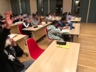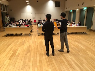 夜8時半前からホールに集まって今日の反省会をしました。司会の子どもたちが進行しています。