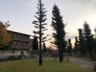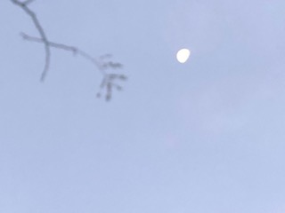 6時半頃の付近の様子です。日の出前の時間です。東の空も明るくなってきていて、下弦の月も高い空にきれいに見えています。風があるものの好天です。