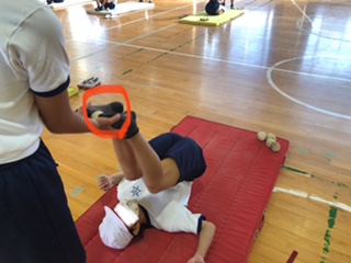 後転の練習をしています。足に玉入れの球をはさんで後転して後ろに立っているペアの子に渡しています。
