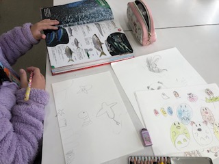 まんが・アニメクラブでは図鑑を見て絵を描いている子どもたちもいます。