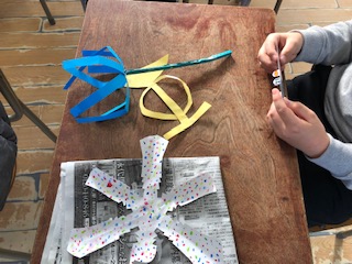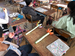 今日はビンゴゲームをしています。それぞれが景品を作っています。