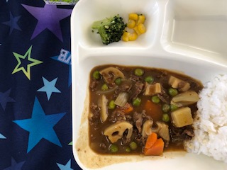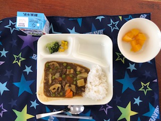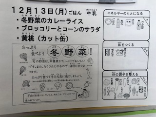 今日は子どもたちに大人気のカレーライスでした。冬野菜盛りだくさんのメニューです。