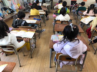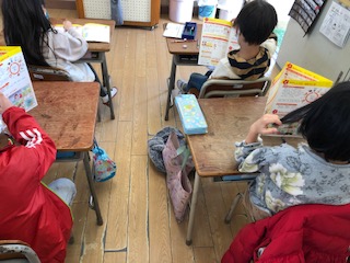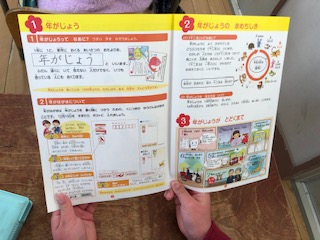 1年生が年賀状の書き方を学んでいます。