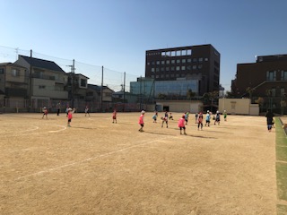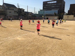 今日はあたたかい晴れの日となっています。ペアでボール投げをしています。