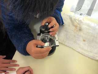 解剖顕微鏡を使って食塩の粒を見ています。