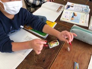 電池と豆電球の間にいろいろな物をはさんで、電気が通っているかどうかを確かめています。