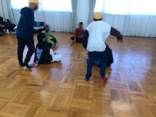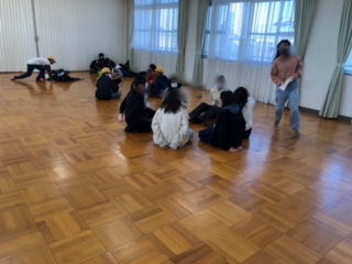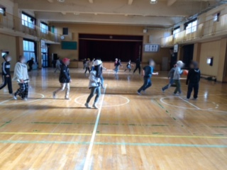 講堂や多目的室でお楽しみ会や誕生日会をしています。バスケットボール、ハンカチ落としですね。