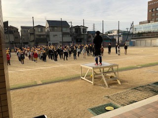 今日は運動場で子どもどうしの間隔を広く開けて児童朝会をしました。