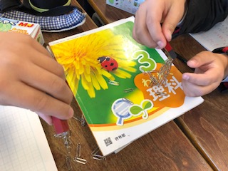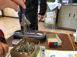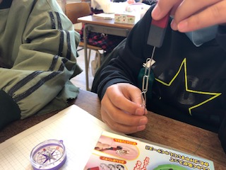 磁石の実験をしています。クリップがたくさんくっついたり、釘にクリップがついたりしています。釘にクリップがつくのはなぜなのかも考えていきます。