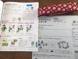 家庭科では、お金と物との関係について学んでいます。現金だけでなく、カードやキャッシュレスなども記載されています。