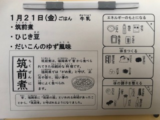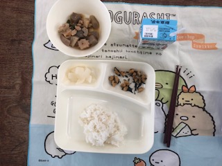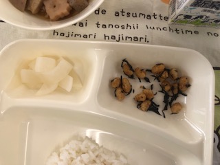 今日の給食は、和食の献立ですね。筑前煮、ひじき豆、ゆず風味の大根がでました。