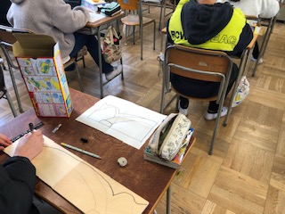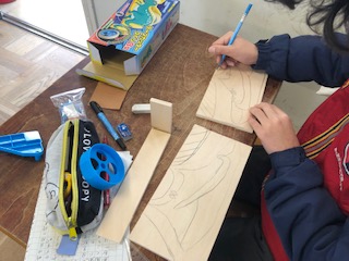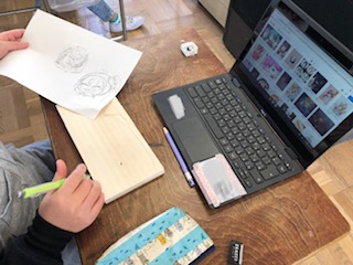 テープカッターを作っていきます。今日は板に絵を描いています。端末から絵をさがして参考にしている児童もいます。