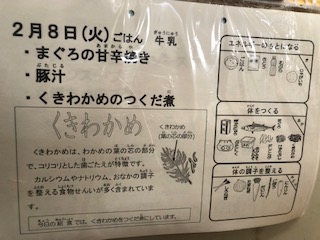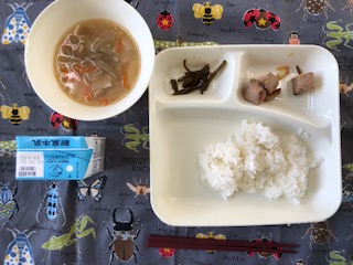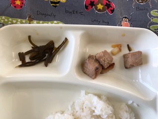 今日の給食には、まぐろがでました。お皿にあるまぐろの甘辛焼きのとなりは、茎わかめの佃煮です。
