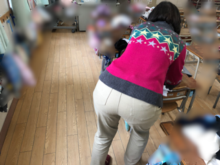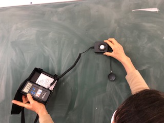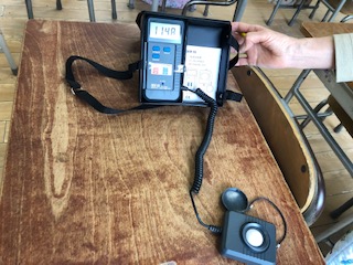 学校薬剤師さんが教室の明るさ(照度)を測定しています。(写真は1年生の教室)